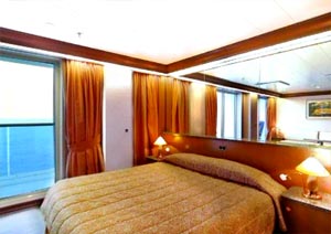 Oceanview with veranda balcony, two lower beds that can convert to queen size, whirlpool bath, shower and sitting area. Direct dial, ship-to-shore telephone service, television, hair dryer, safe deposit box and mini-bar in every stateroom.